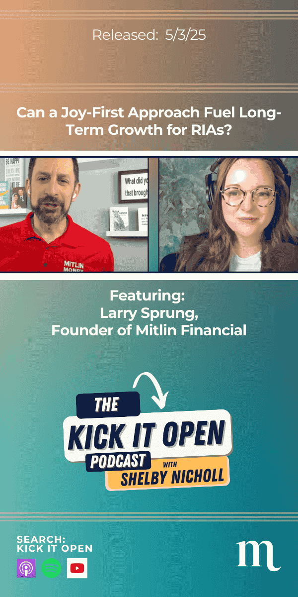 In this episode of Kick It Open, Larry Sprung, founder of Mitlin Financial and host of the Mitlin Money Mindset podcast, shares how a single question — “What did you do today that brought you joy?” — became a guiding principle that reshaped not just his client conversations, but his entire practice.